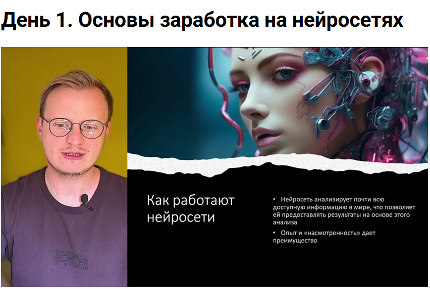Курс прошел в дружелюбной атмосфере, способствующей обмену мнениями. Рекомендую всем, кто хочет использовать нейросети для дохода! Отличное начало для онлайн-предпринимательства!